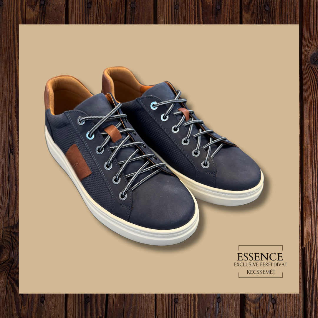 Modern, mégis letisztult stílus! A Lavaggio sötétkék nubuk bőr sneaker sportos megjelenésével és kontrasztos barna részleteivel tökéletes választás a hétköznapokra. A texturált oldalpanelek és a fényvisszaverős hatású fűző modern lendületet visz minden szettbe – legyen szó farmerról vagy chino nadrágról.